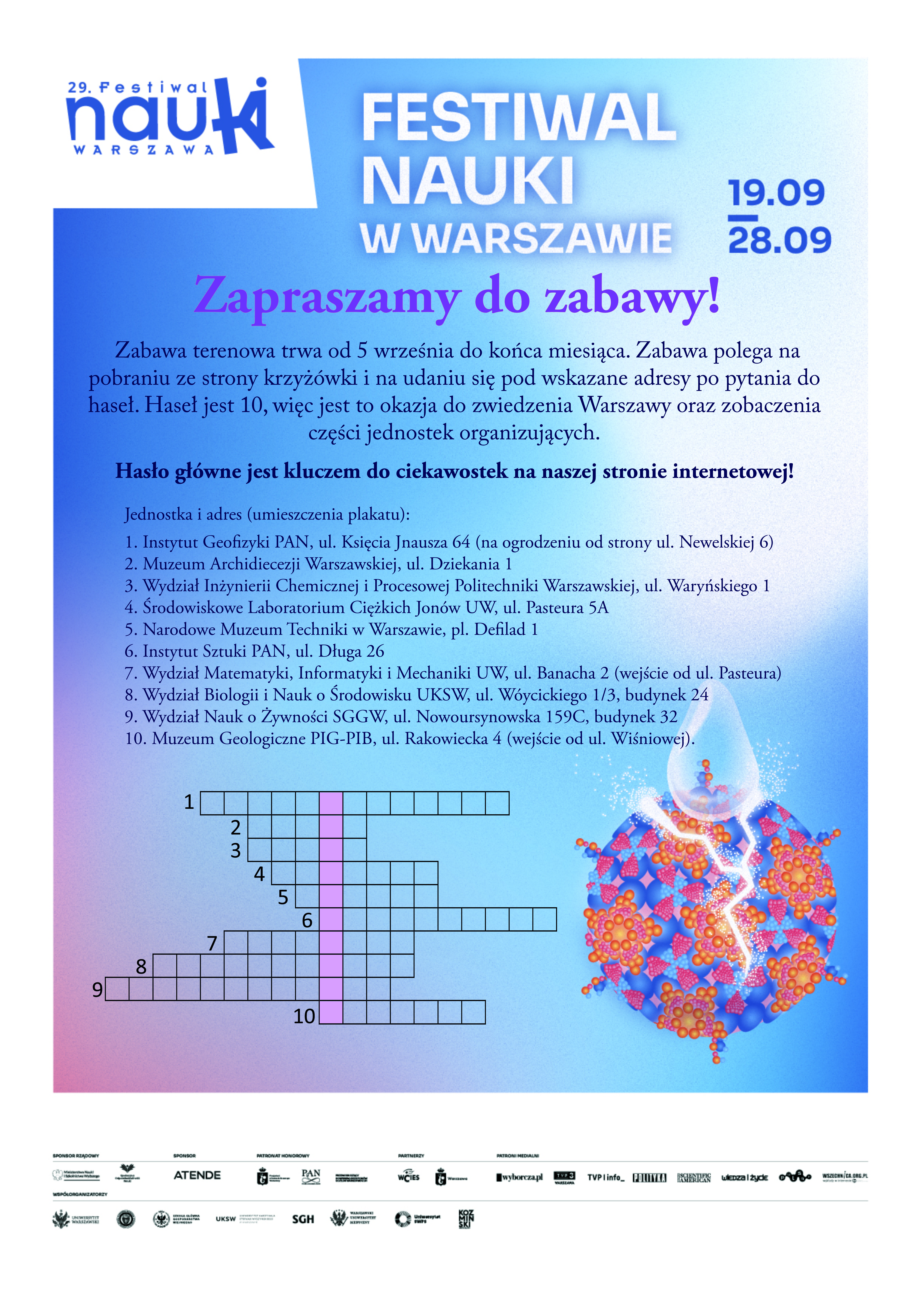 Stworzyliśmy dla Państwa krzyżówkę. Hasła powstały dzięki współpracy instytucji biorących udział w tegorocznej edycji Festiwalu. Pytania do haseł znajdą Państwo w widocznych miejscach, na budynkach instytucji uczestniczących w zabawie.