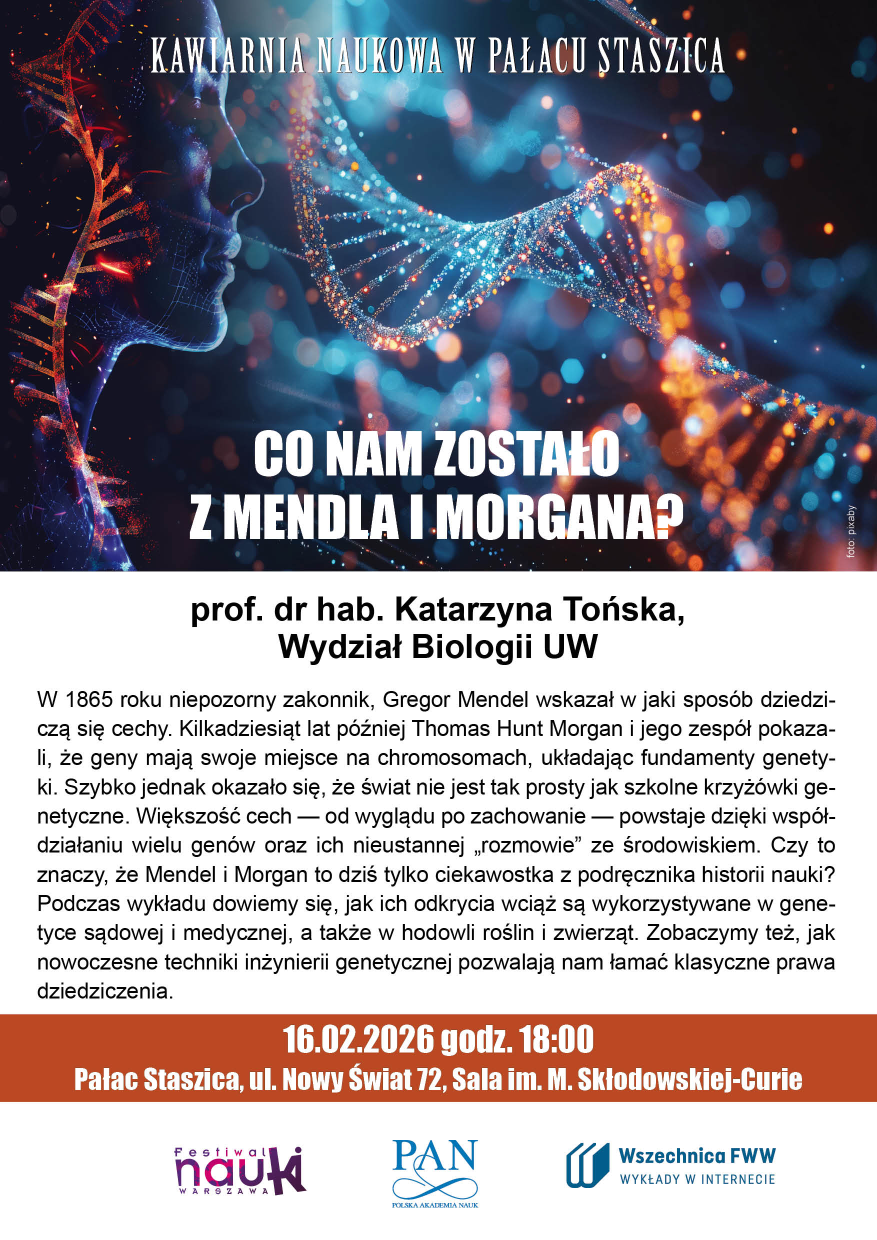 W lutym zapraszamy na spotkanie z prof. dr hab. Katarzyną Tońską z Wydziału Biologii UW, z którą porozmawiamy o tym czy koncepcje Mendla i Morgana są dziś tylko historią nauki, czy są nadal wykorzystywane.